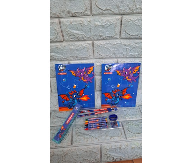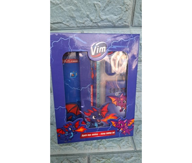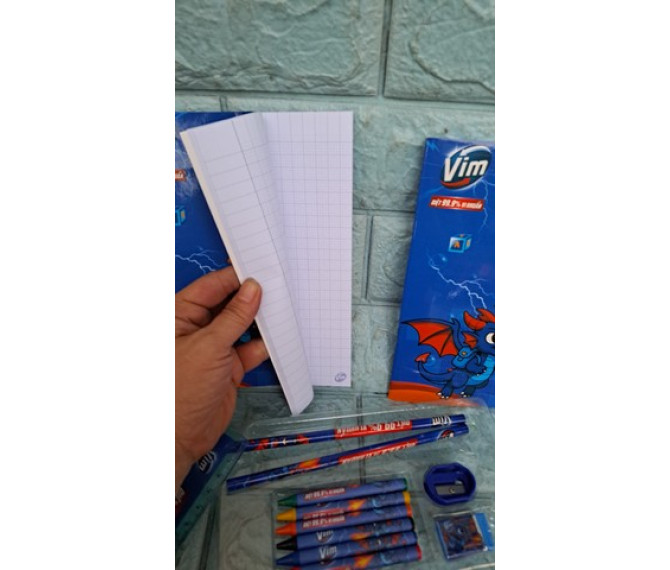 29 ngàn 1 bộ gồm 2 quyển tập, mỗi quyển có 52 trang cả bìa và các dụng cụ học sinh quà từ Vim gồm có 2 bút chì 1 thước, 6 sáp tô màu, 1 chuốt chì, 1 gôm