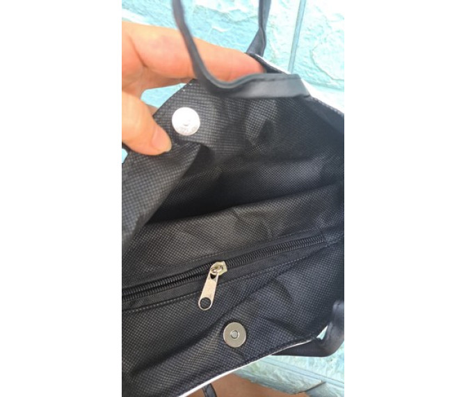 miệng túi có nút bấm, bên trong có 1 ngăn nhỏ đựng vật dụng có dây kéo