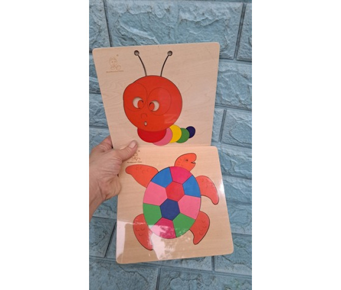 35 ngàn 1 combo 2 bộ đồ chơi ghép hình bằng gỗ cho bé chơi, combo 2 cái 2 mẫu như hình, cho bé làm quen với màu sắc, hình dáng, với chú rùa và em sâu đáng yêu đầy màu sắc. kích thước 18cmx18cm
