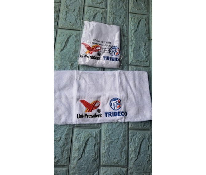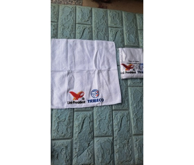 logo thêu màu đỏ nên khi công ty sản xuất gấp khăn đóng vô bao thì có áp màu nhẹ trên khăn như hình ạ