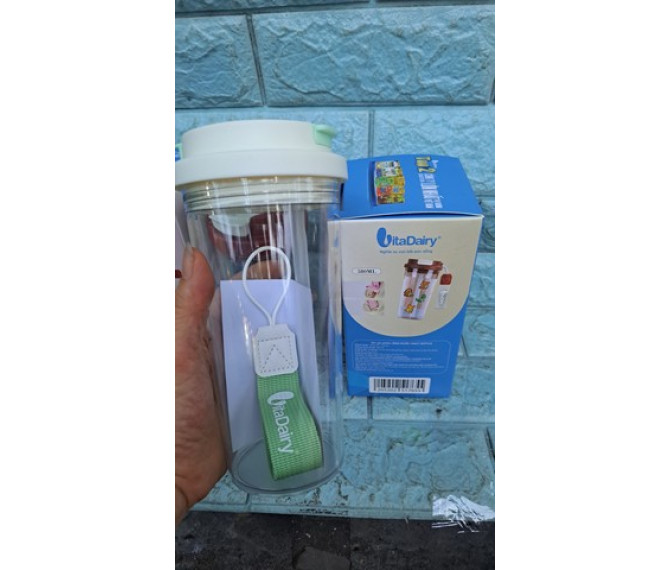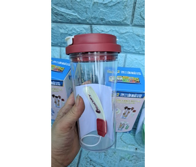 bình nước có dây treo, nắp có van có thể đóng mở cắm ống hút, có tặng kèm sticker trang trí.