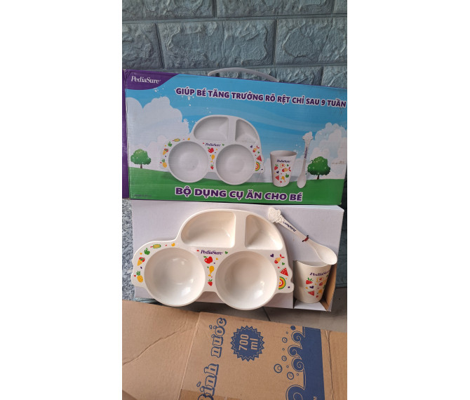 45 ngàn 1 bộ đồ ăn chất liệu melanine, gồm 3 món 1 khay ăn hình xe, 1 ly nước và 1 muỗng ăn cho bé